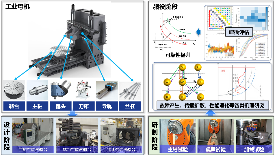 工业母机可靠性关键技术及应用:针对工业母机全生命周期的可靠性设计、试验、评估、维护和系统弹性等核心技术进行深入研究,将故障产生、传播扩散、性能退化等机理具象化,建立“零部件-功能组件-整机”多层级可靠性模型,结合应用场景和使用功能,定制化设计工业母机可靠性试验方案,形成面向于可靠性设计、研制和服役阶段的全生命周期可靠性技术体系。相关研究成果已应用于国产工业母机,服务于航天、航发、兵器等领域,助力国产工业母机综合性能达到对标国外先进产品水平。