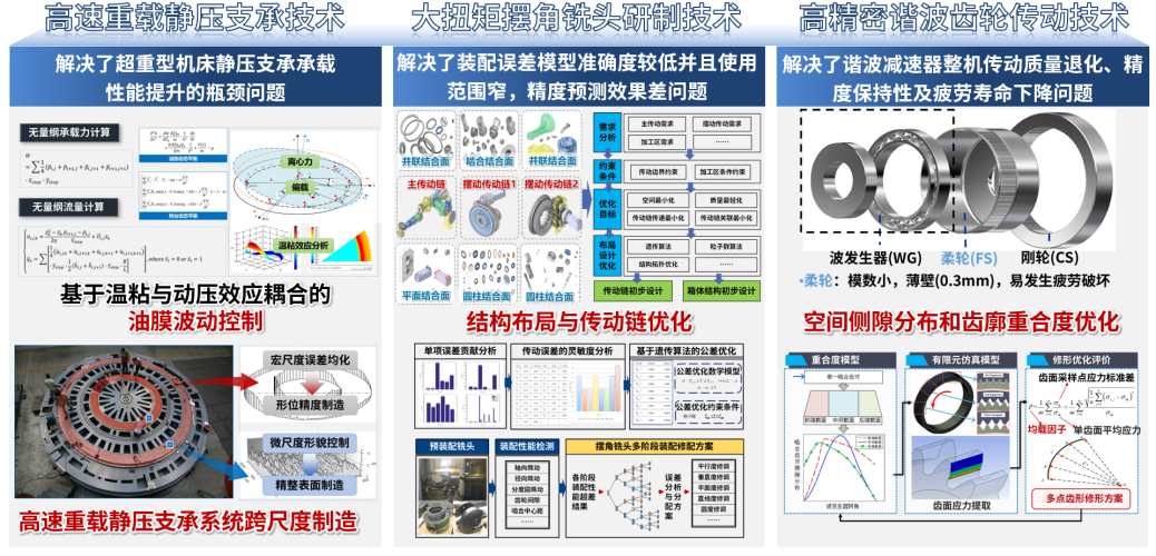 工业母机功能部件与零部件研制:围绕工业母机功能部件在设计、制造和服役过程中的关键技术问题开展相关研究,主要包括:研究多源复杂工况对静压系统油膜动静热特性影响规律,探索高速重载静压支承系统跨尺度制造与油膜控制技术;建立多误差源影响下摆角铣头精度预测模型,突破大扭矩摆角铣头传动链公差优化与整机装配修配技术;提出高冲击负载下谐波减速器空间侧隙分布函数和齿廓重合度模型,突破高重合度共轭齿形的优化设计技术。相关研究成果撑企业产品综合性能达到国际先进水平,实现与国外先进产品对标,切实提升了工业母机设计制造和产品技术水平。